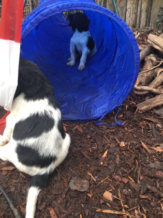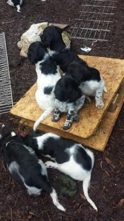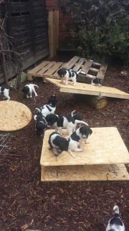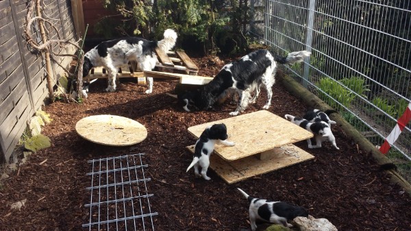 Unsere Welpen mit 4 Wochen im Auslauf wo die Welpen schon Ihre Motorik trenieren können , wo Sie schon mit verschiedenen gegenständen vertraut gemacht werden . Die Welpen können nach absprache auch besichtigt werden mit der Mutter .